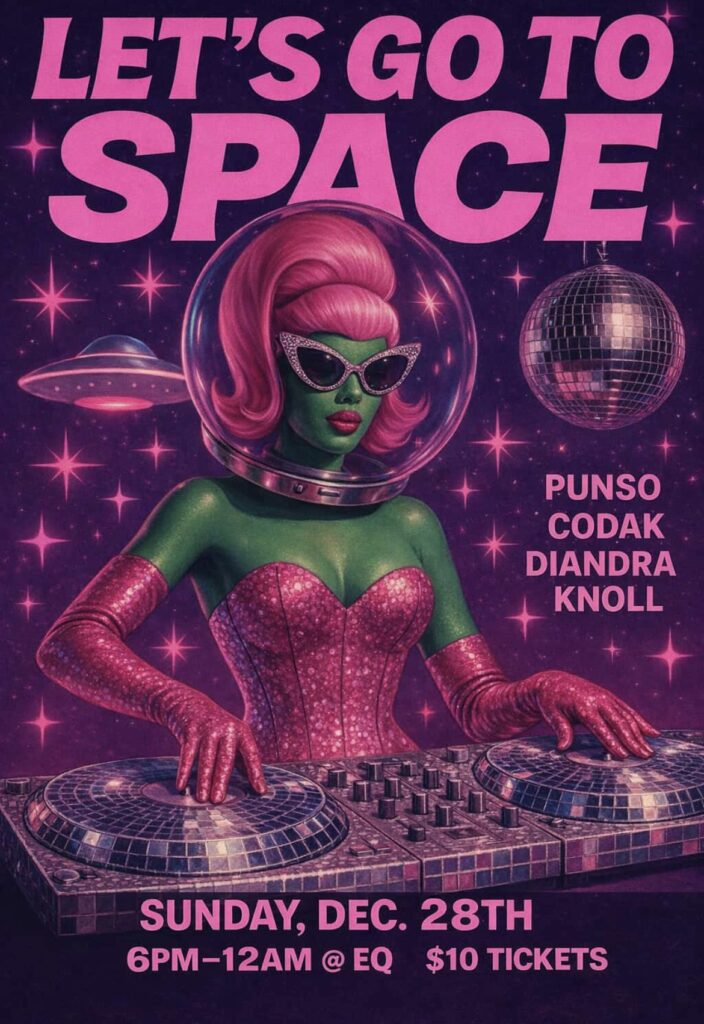 Sunday, December 28 | 6PM–12AM | Calling all Space Rangers, cosmic dancers, and intergalactic groove seekers—this is your boarding call. Strap in and prepare for liftoff as EQ San Diego transforms into a retro-futuristic dance floor where disco balls orbit, house beats pulse through the stars, and the vibes are truly out of this world. Picture neon starlight, cosmic fashion, and a crowd ready to dance like gravity doesn’t exist. Whether you’re a seasoned club voyager or a first-time explorer, this is your chance to escape Earth and lose yourself in the sound. Dress to impress—space glam, disco diva, or futuristic fantasy encouraged! $10 tickets available at the door We’re not just throwing a party—we’re launching a mission. See you on the dance floor. Let’s go to space.